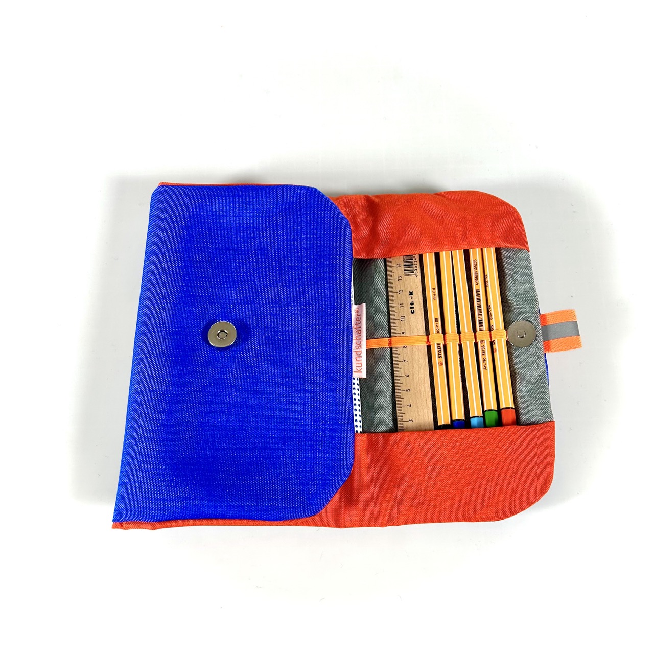 Diese Federtasche (14 x 21 x 2,5 cm, Material: Cordura wie die Schulranzen) passt perfekt in die Mäppchentasche der Schulranzen von kundschafter​®. Mit Magnetverschluss außen, Schlaufen für  Stifte, Füller, Radierer, Lineal … Lieferung ohne Inhalt.